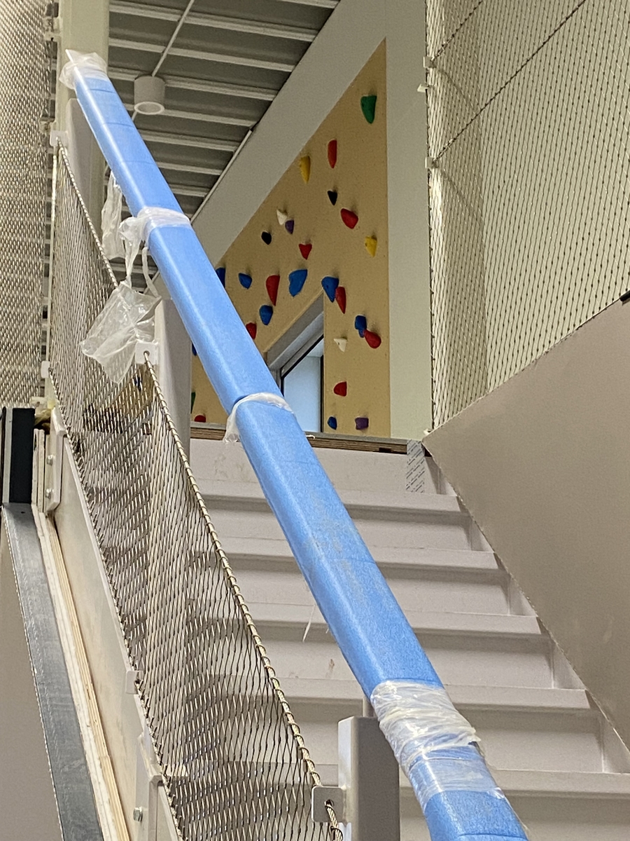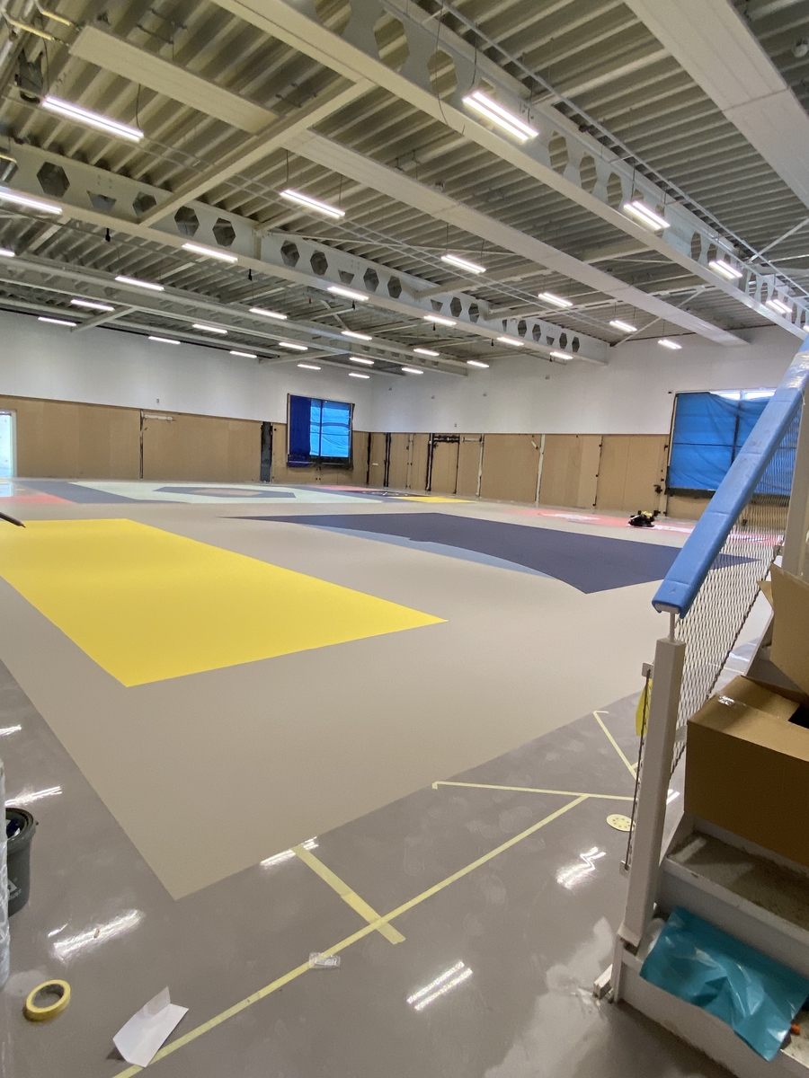Er wordt hard doorgewerkt. Binnen lopen we rond in mooie en ruime en lichte lokalen, frisse toiletruimtes, zien we prachtige pantries voor de opvang, een spannende tribunetrap, de kleuren van de vloeren van de gymzaal en het uitzicht naar buiten. Genieten!