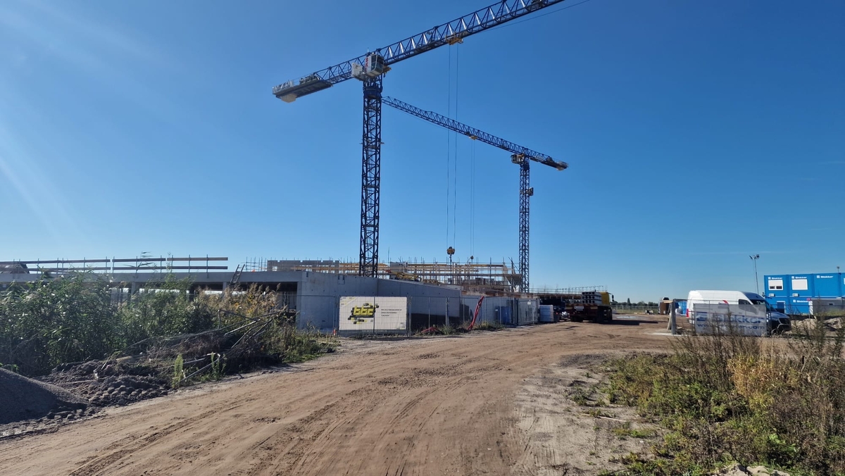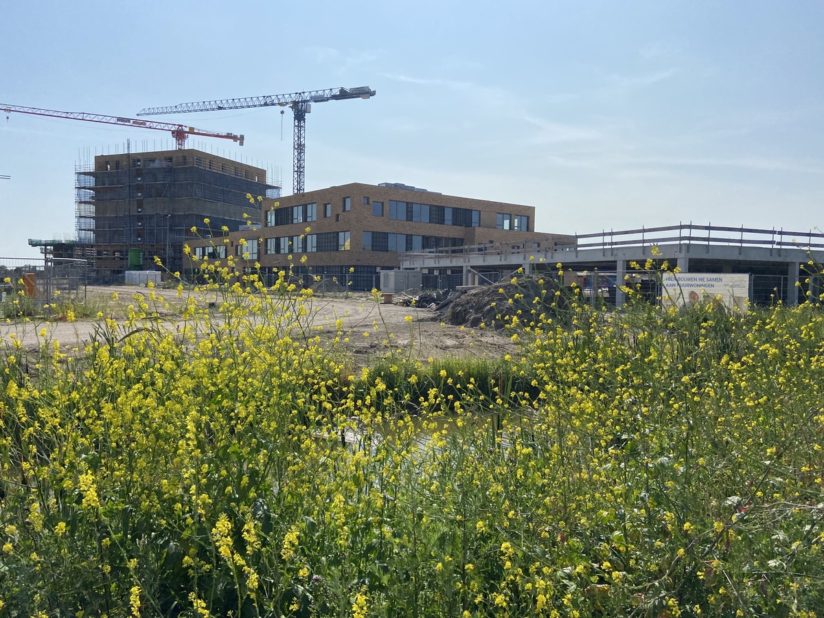 De grote hijskranen zijn vanuit de verte goed te herkennen. Mooi om te zien hoe het gebouw groeit.